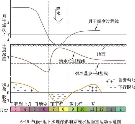 在干旱少雨,缺乏灌溉时,由于地表蒸发强烈,会导致土壤深层的水分随毛管向上运动,溶解于水中的盐类聚集于土壤表层,形成旱季土壤盐分向上运动,雨季又随重力水向下运动的现象。